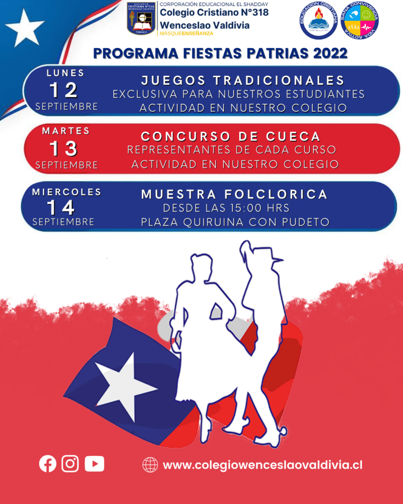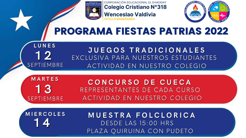 Estimadas familias, junto con saludar les informamos la programación de actividades de Fiestas Patrias organizadas por nuestro colegio: